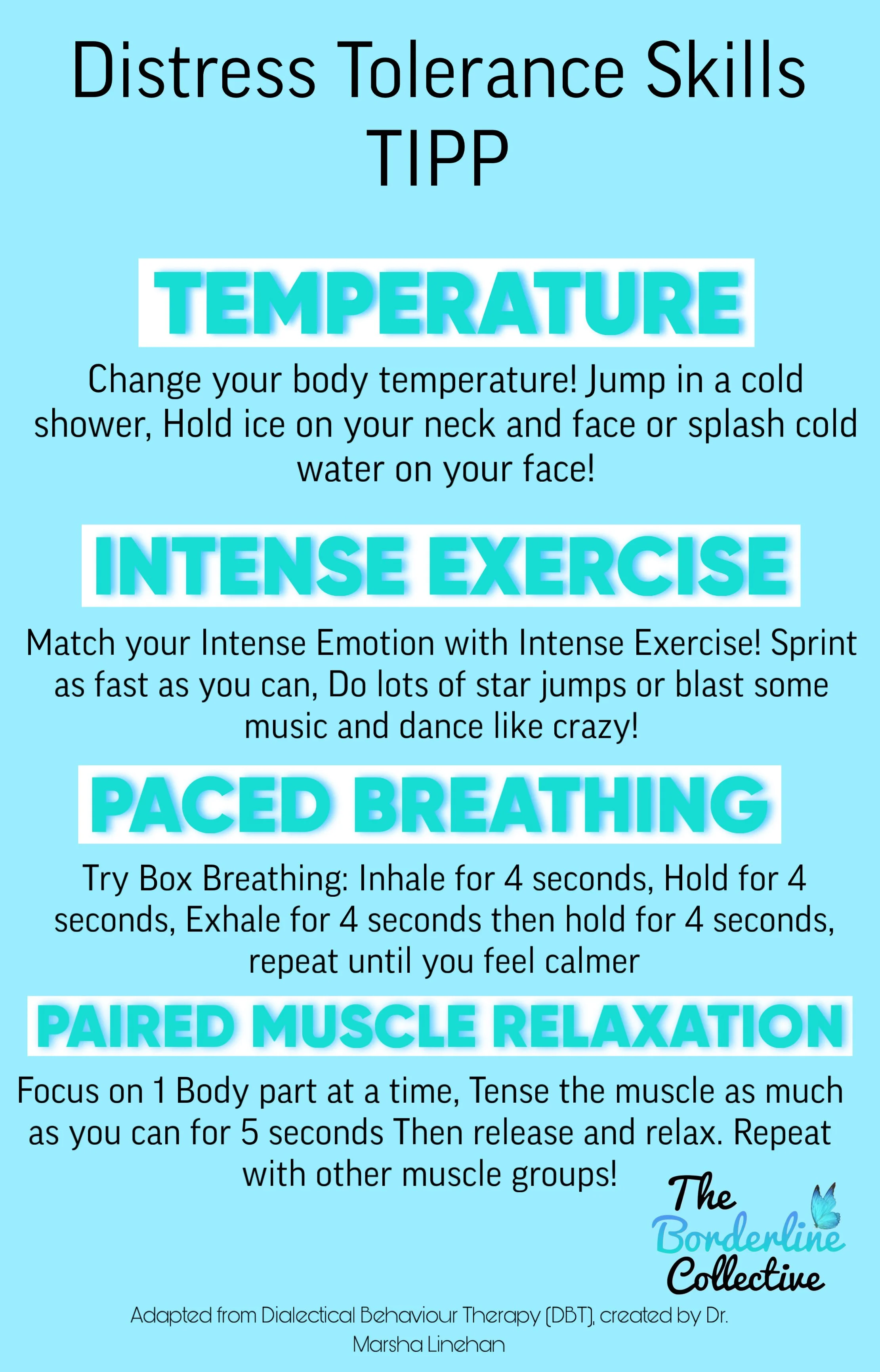 Disclaimer: these DBT skills are adapted from Dialectical Behaviour Therapy developed by Dr Marsha Linehan. This page is for educational purposes only and is not a substitute for professional advice. Please reach out to a mental health professional for individual support.