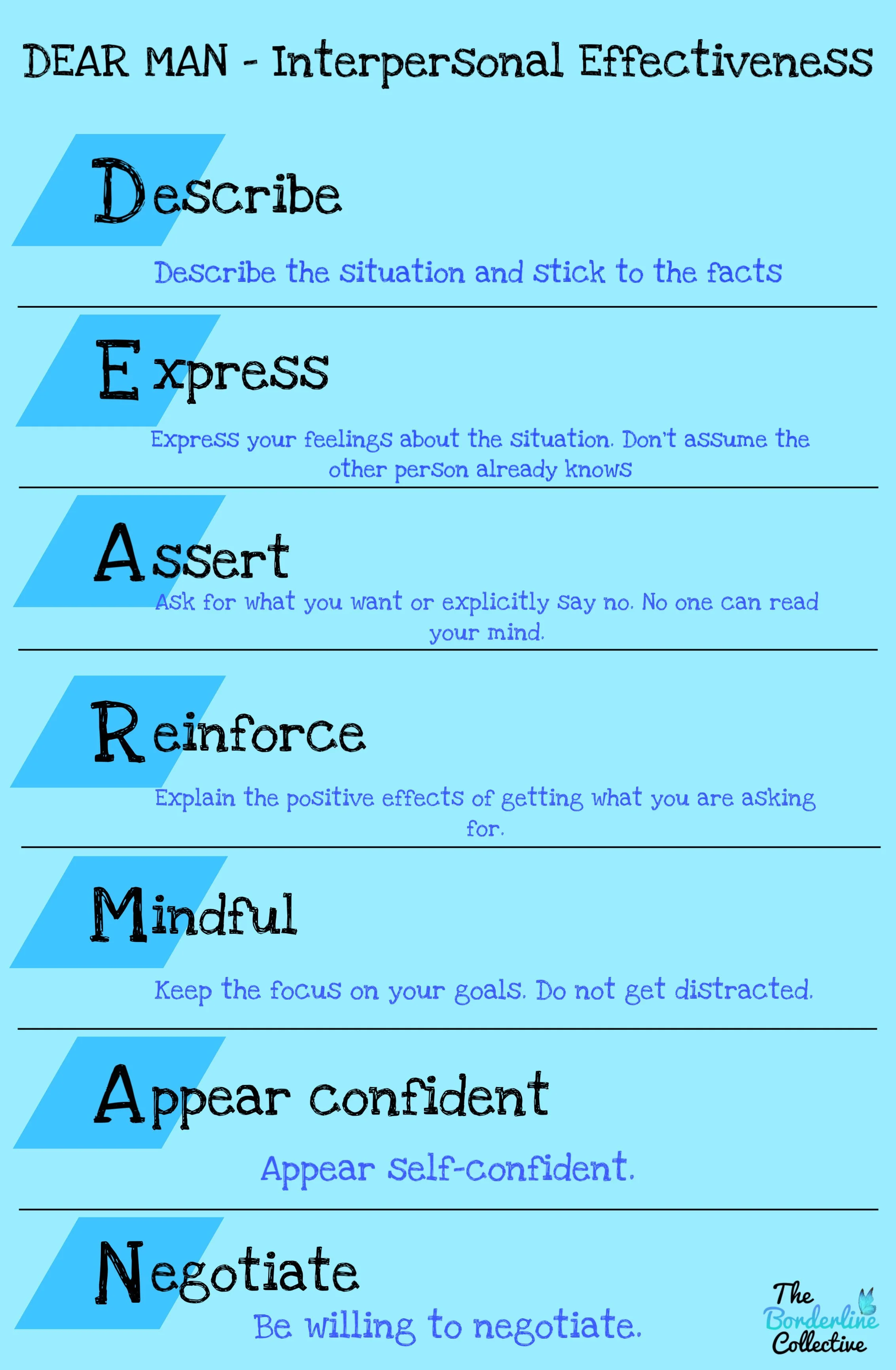 Dear man is a step-by-step skill for asking for something or setting a boundary using assertive communication.